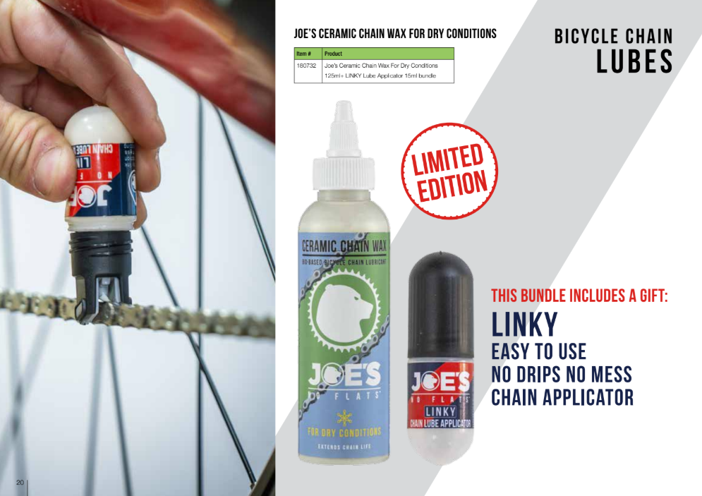 A Joe’s limitált kiadású csomagja tartalmazza a Ceramic Chain Wax Dry kenőanyagon kívül a Linky Lube Applicatort is, ami praktikus megoldást kínál a kenőanyag tiszta, precíz és hatékony felvitelére.